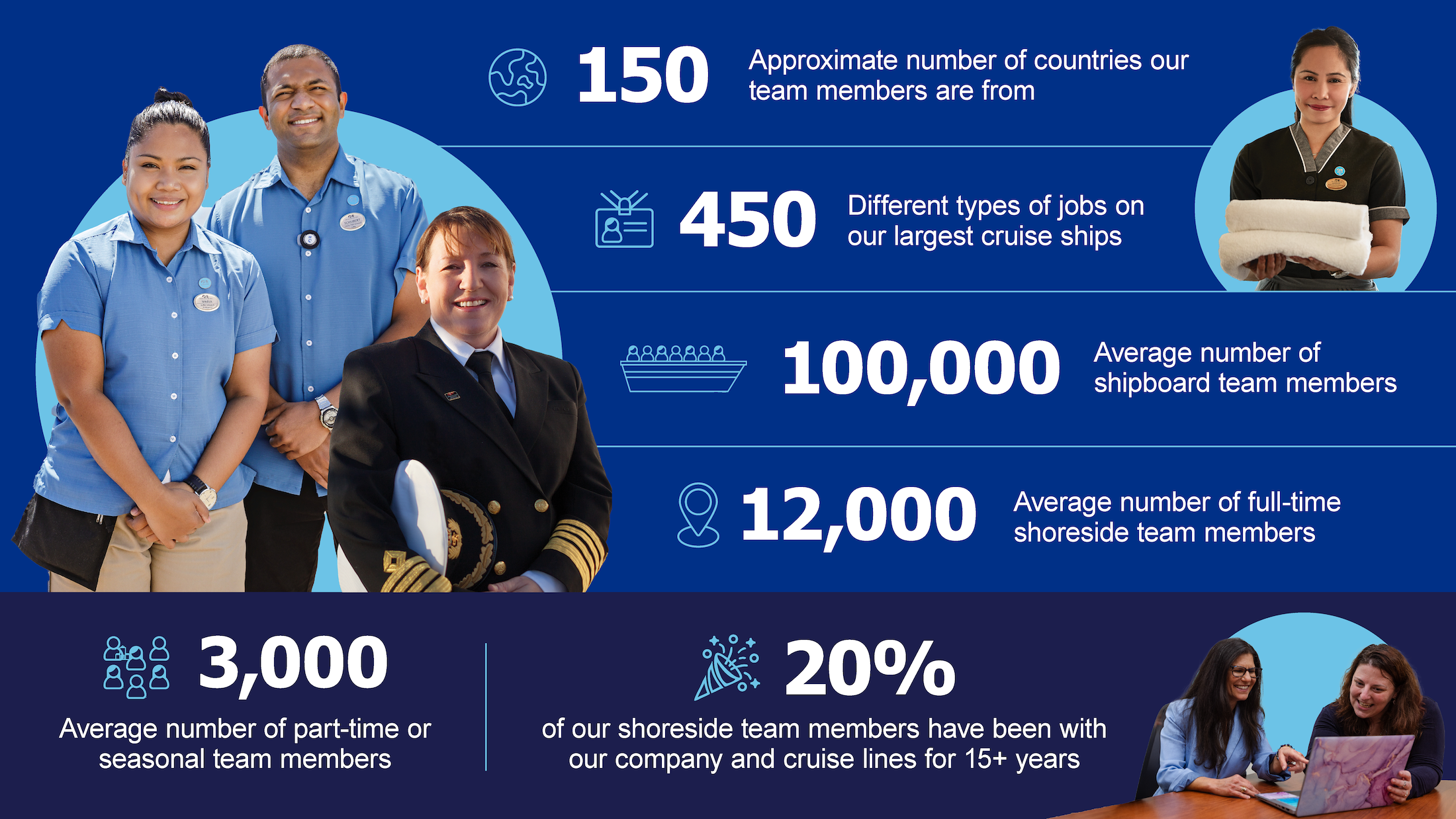At Carnival Corporation & plc, we offer a variety of opportunities as wide-ranging as the ports and destinations we visit. From the unexpected onboard, like a kennel master caring for beloved pets at sea, to land-based roles supporting our seafaring colleagues, the career choices are truly limitless. Whatever your passion or expertise, you’ll find a place to excel and make an impact.